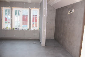 Da er vi godt i gang med flislegging på hovedbadet. Vi har valgt store grå flis på gulv, på en vegg og i dusjhjørnet. For lettere å få til fall på gulvet, valgte vi i tillegg moasikkflis på gulvet i dusjen. Selve dusjen blir noe smalere enn standard, da den blir 85 cm i bredde. I dybde derimot er den mer enn stor nok, da den her er rundt 115 cm. Så da blir det ok størrelse på dusjen. Som dere kanskje også legger merke til, er det skråtak, og dermed ikke så høyt på det laveste punktet i taket. Dermed må det spesialmål til når det kommer til dusjdør. Jeg tør ikke tenke på hva denne koster en gang. Og her er vi ved en ulempe ved å tilpasse det nye i forhold til det gamle - at det ikke blir standardmål på alt. Og når ting må spesialtilpasset blir sluttsummen noen tall større. Men som allerede nevnt, jeg tror vi klarer å komme i land til budsjett.