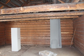I disse dager er det barnas soverom som står for tur i renoveringen. Dette er to rom som hver blir på rundt 15 kvadrat - med andre ord mer enn nok boltreplass. På det øverste bildet er det ene rommet avbildet før vi begynte å rive. På det andre bildet er gulv, vegger og tak blitt revet, slik at tømmeret kommer til syne og der vi ser rett opp i husets bærende takkonstruksjoner. Dette er massive trestokker som er tunge og solide, og som snart har tålt 160 vintre og somre. Forhåpentligvis tåler de 160 til.